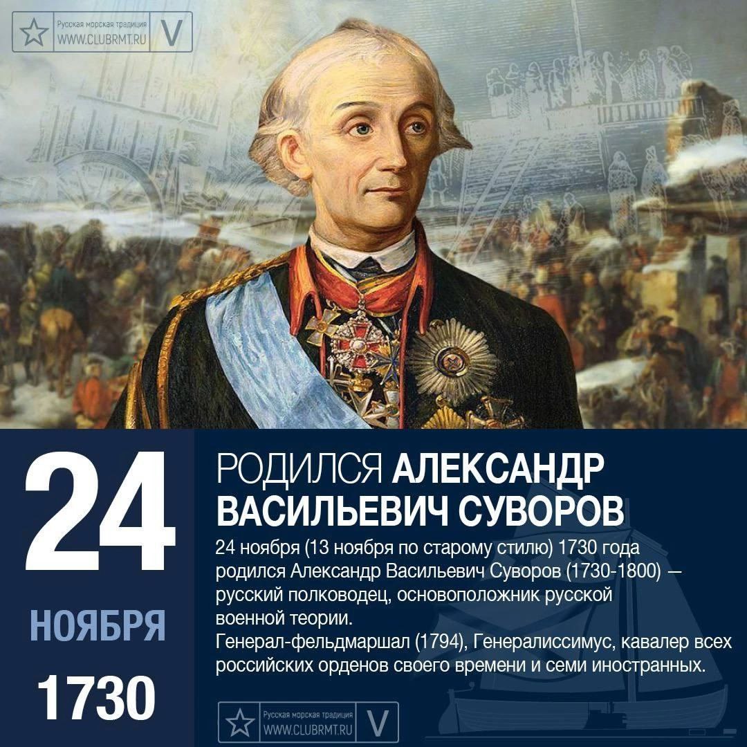 Сегодня понедельник 24 ноября 2025 года. День рождения в 1730 году (13 ноября по старому стилю) Александра Васильевича Суворова, русского полководца