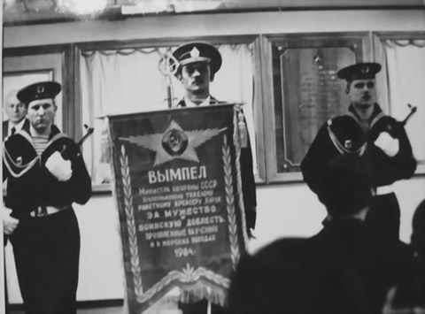 “Крейсер “Киров” объявлен лучшим в Военно-Морском Флоте в ракетной стрельбе по морской цели. Его экипаж удостоен высокой награды награды — Вымпела Министра обороны СССР за мужество и воинскую доблесть. Корабельная ударная группа, в состав которой он входит, по ПВО завоевала приз главнокомандующего ВМФ. |