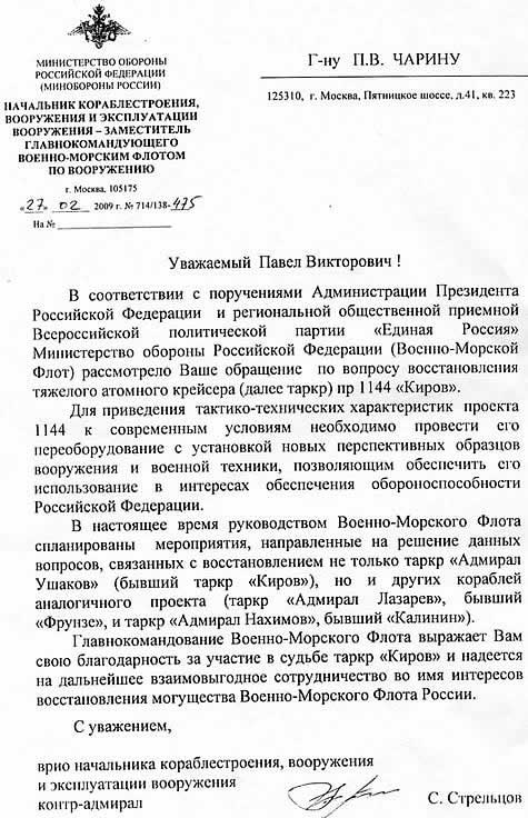 | Мы обращаемся ко всем, кому небезразлична слава России, ее история, настоящее и будущее с призывом и просьбой оказать всяческое содействие в сборе средств на ремонт и сохранение в составе боевых сил Военно-Морского Флота тяжелого атомного крейсера "Адмирал Ушаков". Это станет нашим общим вкладом во славу России и ее Военно-Морского Флота. Главнокомандующий Военно – Морского Флота РФ, адмирал флота В. И.Куроедов. Председатель правления благотворительного Фонда по восстановлению и модернизации крейсера "Адмирал Ушаков", депутат Государственной Думы В.Н.Лопатин. 08.08.1999г |